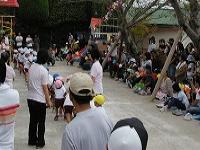 | お母さん達の競技は「輪投げ」です。フラフープ3本を一升瓶に投げ入れると次の人と交代です。子ども達も応援しています。 | ||