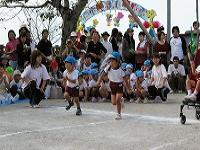 | あか・き・ももぐみのかけっこ。小さくてもゴールを目指して一生懸命走っています。 | ||