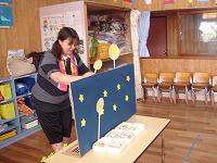 | 今月は男の子1人の誕生会。みんなからお祝いしてもらいました。出し物は「こんばんはお月様」というお話でした。お月様の所には秋にまつわる動物や植物、UFO?までやってきました。なぞなぞにもなっていたので、みんないろいろ考えながらお話の中に入り込んでいました。楽しいお話でした。 | ||