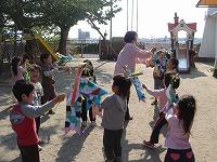 | 5月5日の端午の節句を前に、こいのぼりを作りました。色画用紙を切り合わせて、最後に自分の手形をうろこ代わりにして完成です。園庭に出て空を泳がせて楽しみました。 | ||