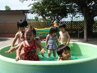 | 今年もプールの季節がやってきました。園庭に数メートル四方のプールを設置して、あおぐみとももぐみの子どもたちがプール遊びを楽しみます。きぐみとあかぐみの小さい子はもう少し小さいビニールのプールで水遊びです。これからおよそひと月、週に2回の夏の風物詩です。 | ||