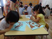 | 朝、猛烈な雨が降り、予定していたプール遊びができませんでした。部屋の中での活動を保護者のみなさんに見ていただきました。絵の具を使ってのスタンプ遊び、吹き絵、折り紙などをして作品を作っていました。保護者の方々にも参加してもらって素敵な作品が出来ていました。お忙しい中、多数参加していただきありがとうございました。 | ||