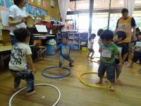 | 6月は雨や水たまり、カタツムリになるなど梅雨の時期ならではの活動がメインでした。ピアノで効果音を入れた絵本の読み聞かせや2・3・4人で手合わせしたり、体の部位を意識した動きもありました。カラーボードを使ったり、お店で買い物をしたりして2・3・4拍子のリズムを感じる活動もしました。 | ||