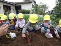 | 5か月間かけて大きくなったお芋を収穫しました。き・ももぐみは保育園の菜園で、あおぐみは園長先生の菜園でお芋ほりを行いました。今年は梅雨の時期長雨で夏は猛暑で過酷な環境だったので、途中で溶けたり、枯れたりした苗もありました。それでも収穫したお芋は大きなお芋もあって、子どもたちはとっても喜んでいました。おやつの時間に大活躍します。 | ||