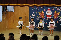 はじめのことば / 「花あそび~ふるさとのいろ」(あおぐみ) / 「まあるいたまご」(あかぐみ) / おはなしミュージカル「北風と太陽」(ももぐみ) / 「ぷるるーん、アヒル」(きぐみ) / 梅の花、咲いた」(あおぐみ) / 指遊び「大きな栗の木の下で」「どこでしょう」・楽器遊び「サンタクロース」(あかぐみ) / 「Tomorrow」(ももぐみ) / 「羊のモコモコ」(きぐみ) / 「ともだち賛歌」「聖者の行進」(あおぐみ) / 「崖の上のポニョ」(ももぐみ) / 「羞恥心」(あおぐみ) / 「手をたたきましょう」「まつぼっくり」(きぐみ) / 「PEACH」(あおぐみ) / 「カレーライスのうた」(きぐみ) / 合唱「せんせいとおともだち」・合奏「ありさんのお話」(ももぐみ) / 「一剣」(あおぐみ) / 「ふしぎの国のアリス」(あおぐみ) / 全園児合唱「あわてんぼうのサンタクロース」