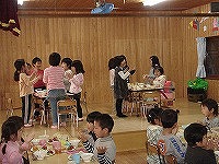 | 3月は4人のおともだちがお誕生日を迎えました。みんなの前で紹介され、「ハッピーバースデー」の歌でお祝いしてもらいました。出しものは「おさるのほいくえん」でおさるさんたちが次々と登場し、今年1年でどんなことができるようになったか、お話ししていました。それを聞いて園児たちは、それぞれがこの1年で自分ができるようになったことを発表しました。お昼が近づき、引き続き、卒園する園児を囲んでみんなで食事をする「お別れ会食」になりました。「給食コーナー」のページにもあるように、この日はサンドイッチにミニハンバーグ、いちごと、みんなが大好きなメニューが並びました。あんなこと、こんなこと、いろいろなことを楽しくおしゃべりしながら、おいしくいただきました。 | ||