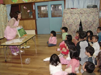 平成23年度から、3歳以上児を対象に「リトミック」という取り組みを始めました。「リトミック」とは、スイスの音楽教育家・作曲家ダルクローズによって提唱された音楽教育です。日本でも明治時代に紹介され、その後、幼児教育や障害児教育でも応用されるようになりました。身体の動きを通して音楽を体感し、心身の調和と一致を促し、音楽的なセンスを培うものです。特定非営利法人リトミック研究センターでインストラクターの認定を受けた講師を招いて、毎月2回実施しています。「リトミック」では動きを通して音楽を学ぶので、その学習過程では創造性や想像力が養われ、その結果生活に必要ないろいろな感覚的センスを総合的に経験することができます。